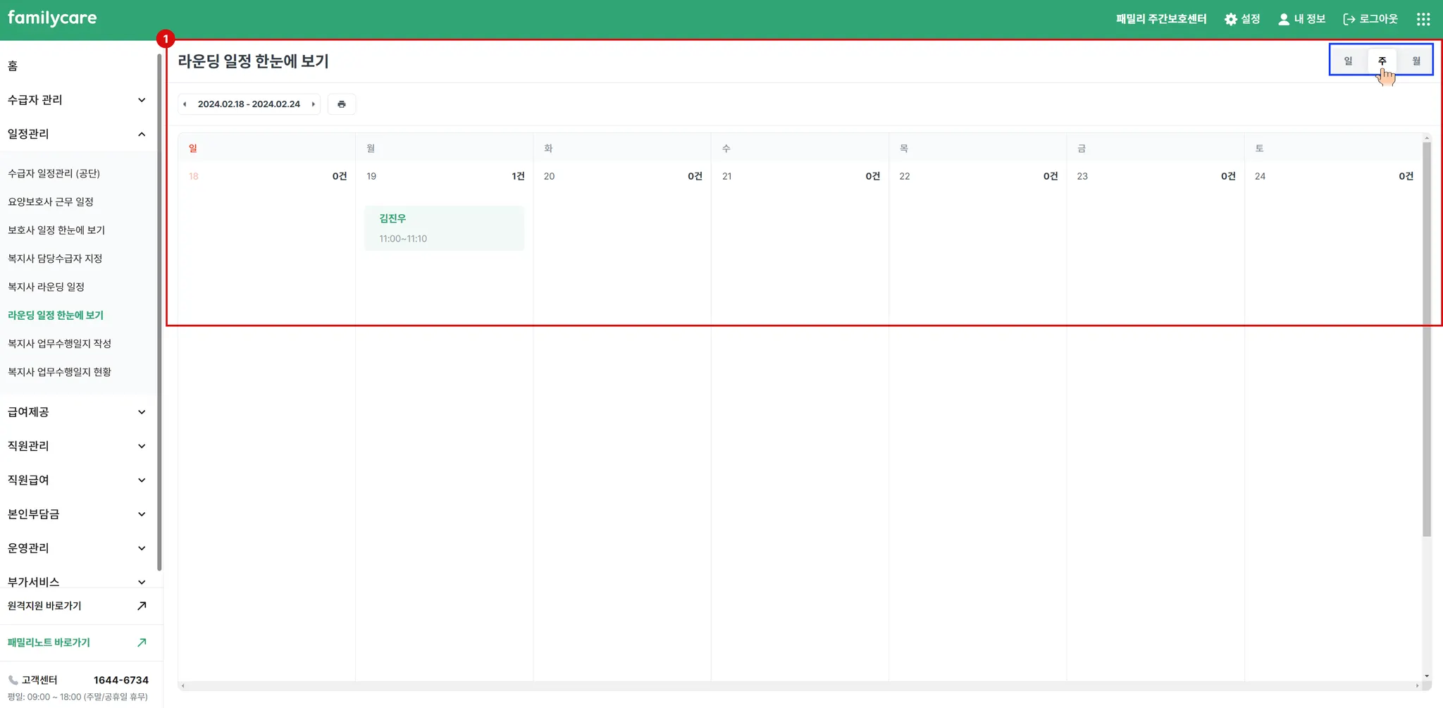 주별로 사회복지사의 업무수행일정을 확인 할 수 있습니다. 출력버튼을 통해 주별 업무수행일정을 출력할 수 있으며, 업무수행일정이 있는 수급자의 이름과 방문시간이 노출 됩니다.