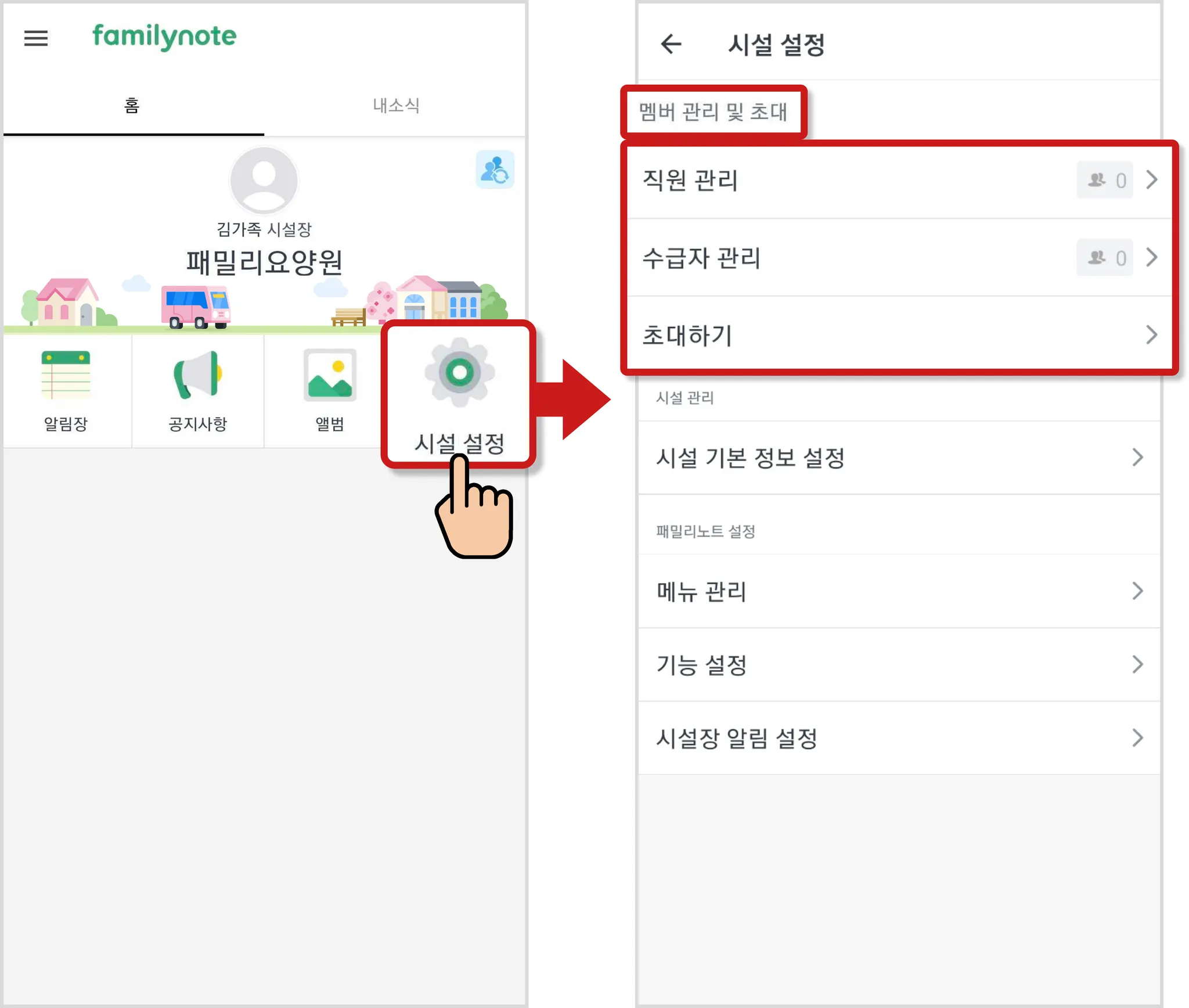 -초대하기: 직원과 보호자를 우리 시설에 초대할 수 있어요.