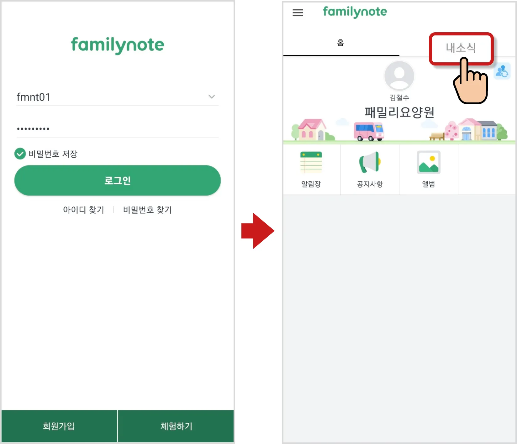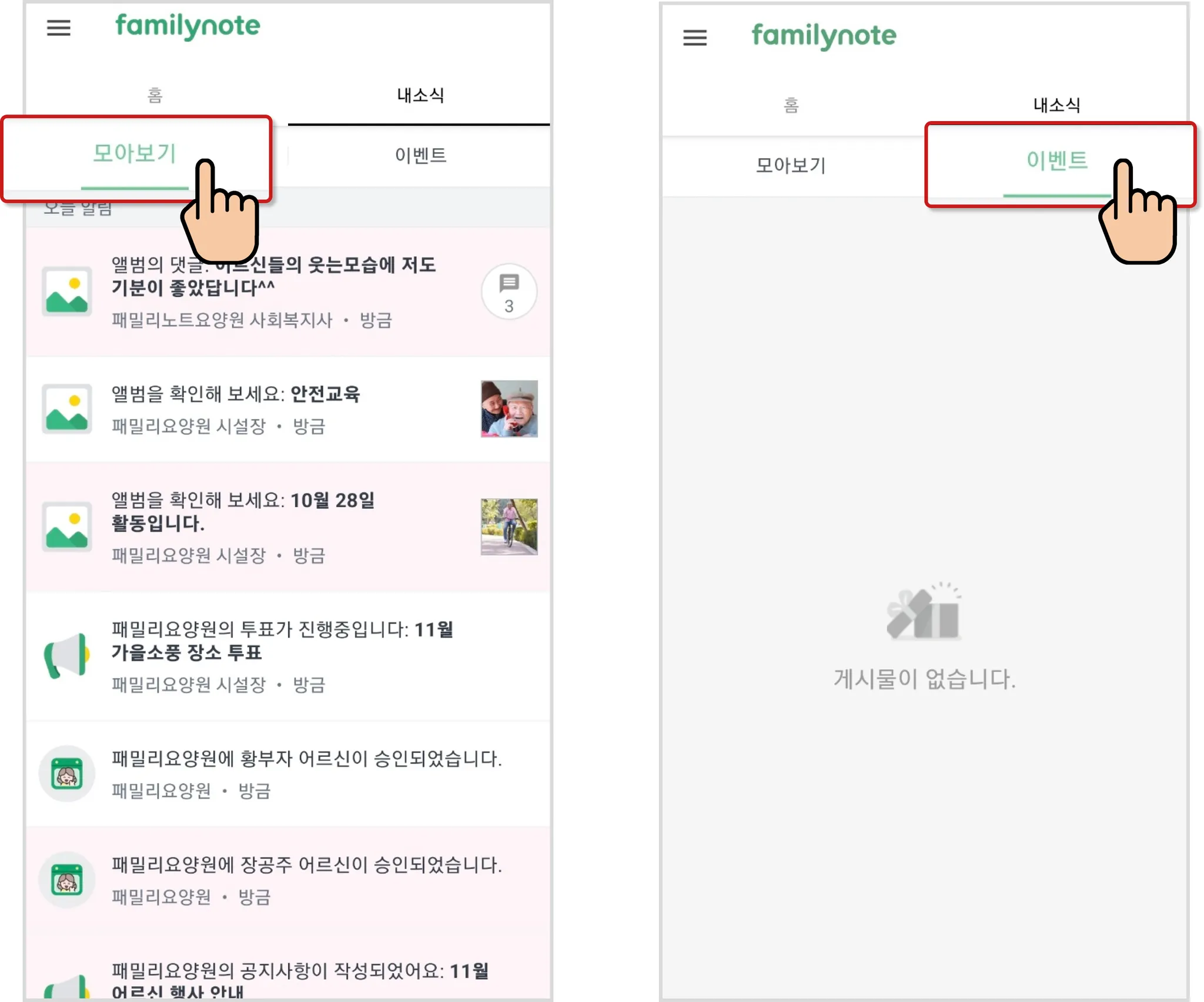 내소식에서는 게시글 업데이트 및 댓글 등 다양한 소식을 알림으로 받을 수 있는 모아보기와 패밀리노트의 소식이 담긴 이벤트를 확인할 수 있어요