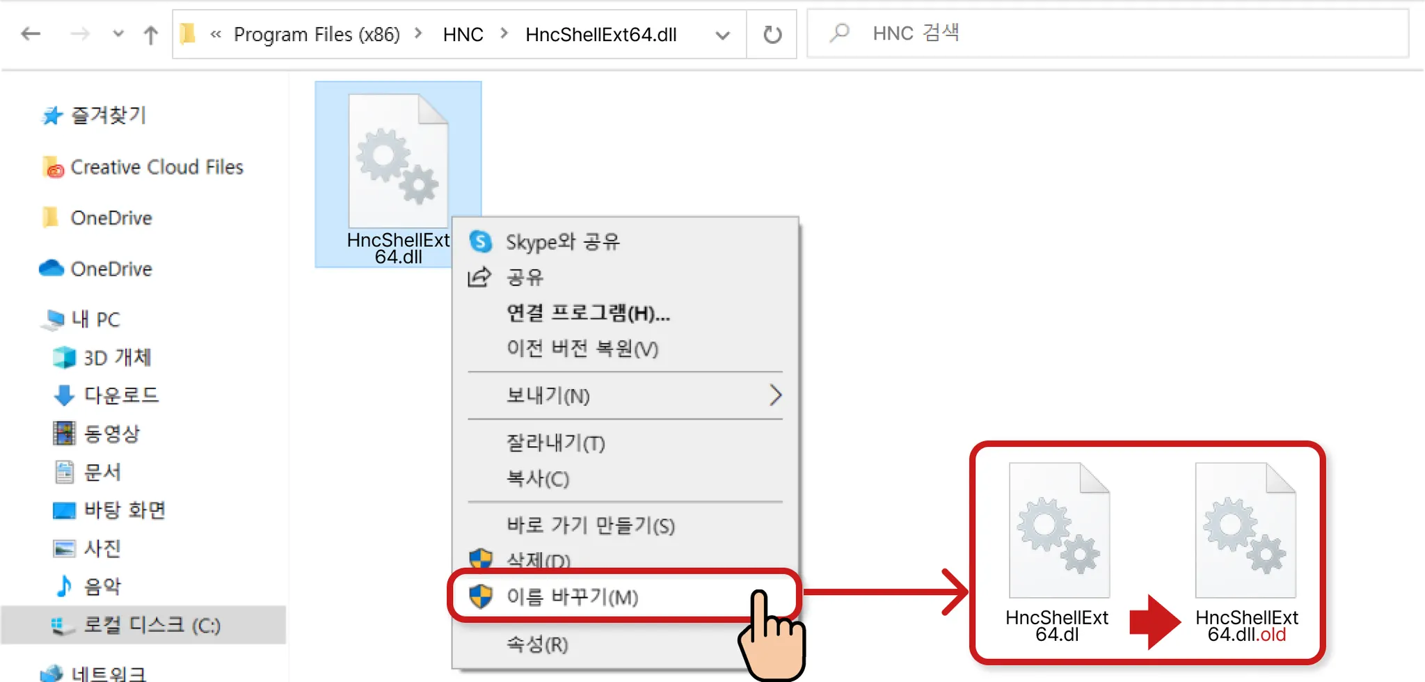 이름 제일 끝에 .old를 붙여 HncShellExt64.dll.old로 수정합니다.