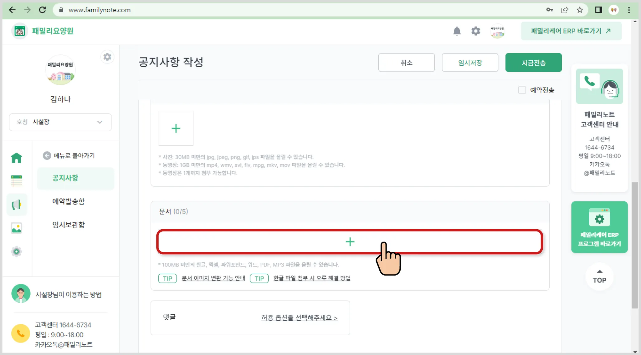 이제 다시 패밀리노트에 접속한 뒤, 공지사항 메뉴에서 한글 파일일 첨부를 해보시기 바랍니다.