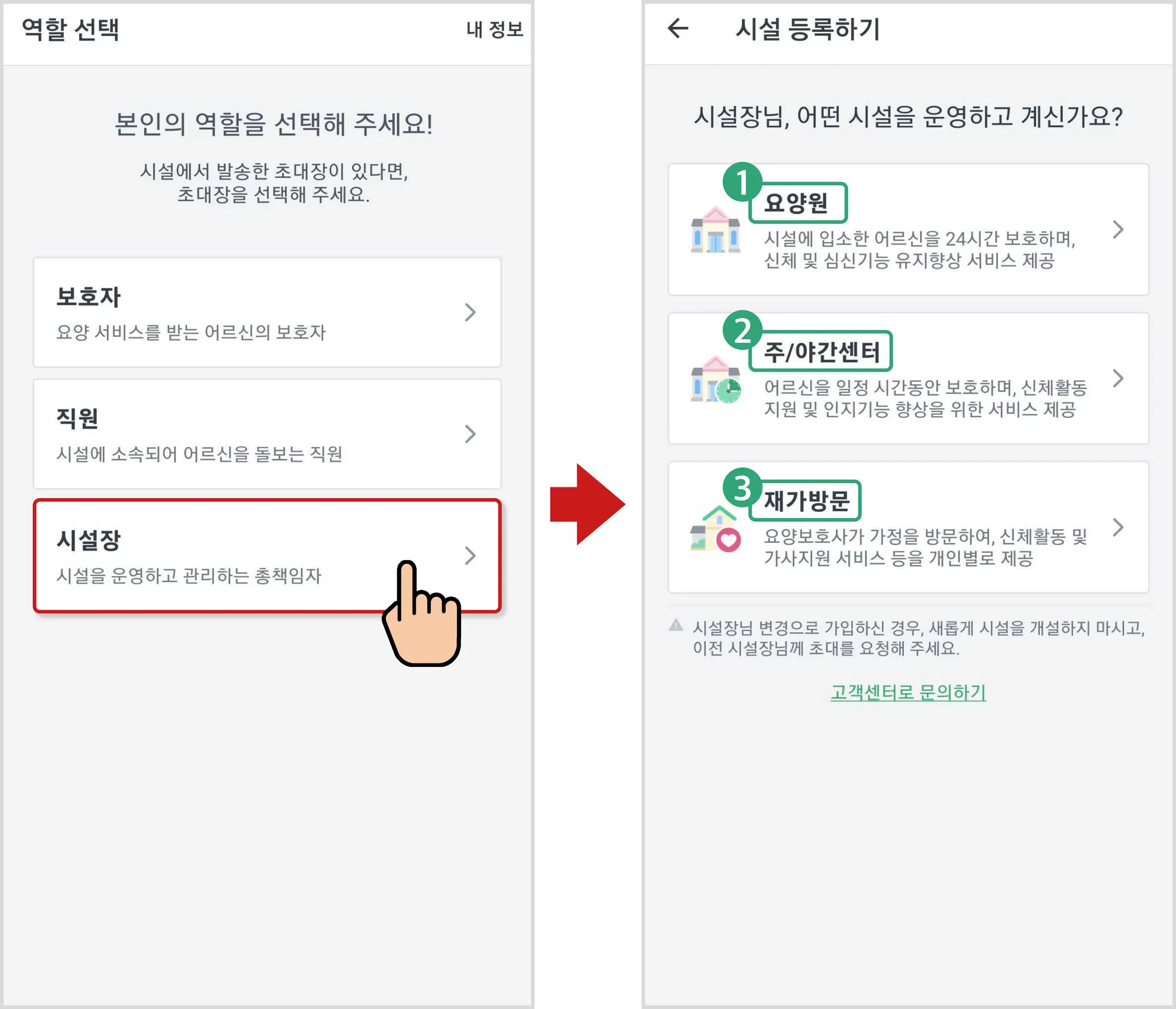 [역할 선택]화면에서 시설장을 누르면, [시설 등록하기]화면으로 이동합니다.