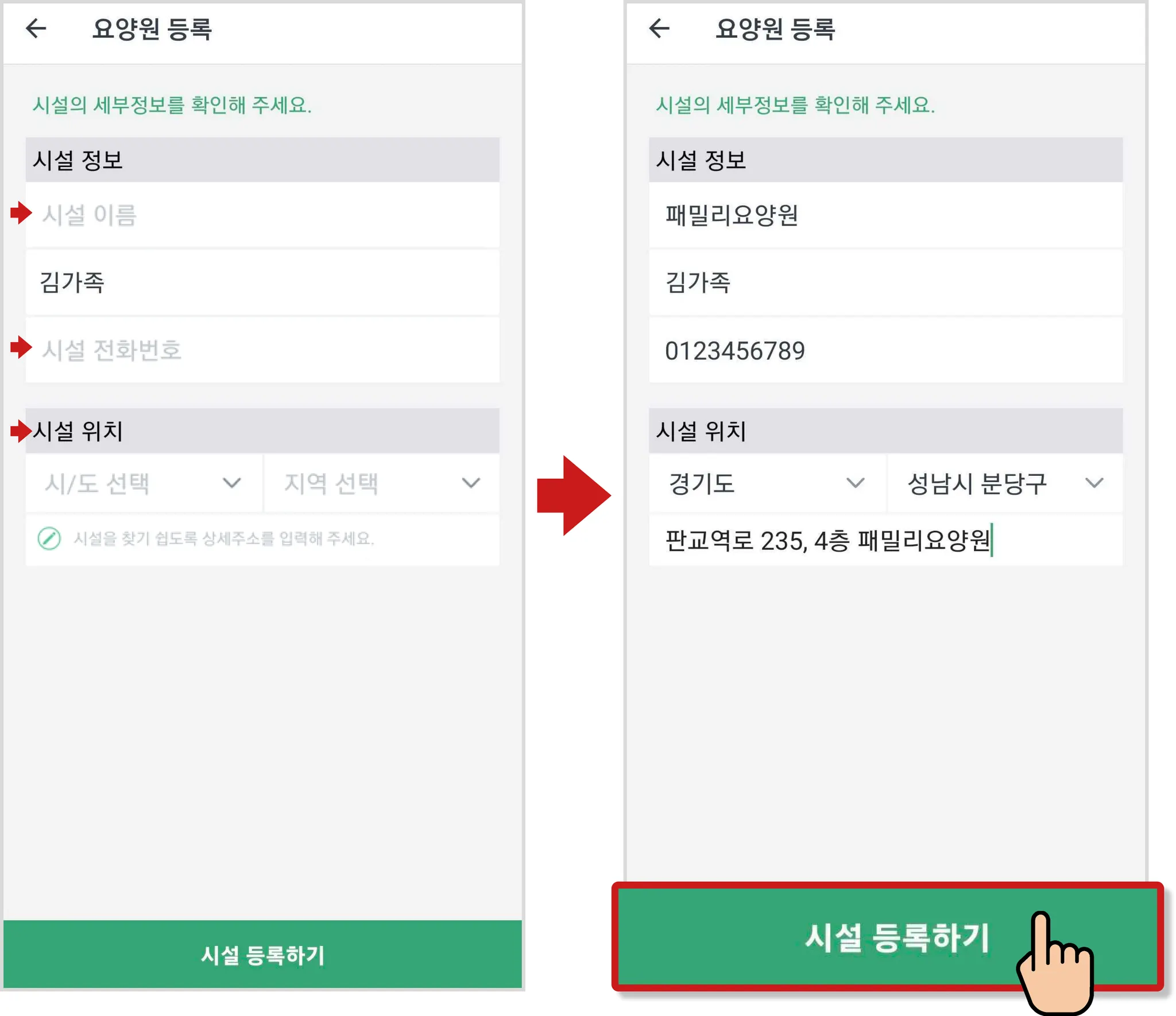 -시설 이름, 시설 전화번호 , 시설 위치를 입력 후, [시설 등록하기]를 눌러주세요.