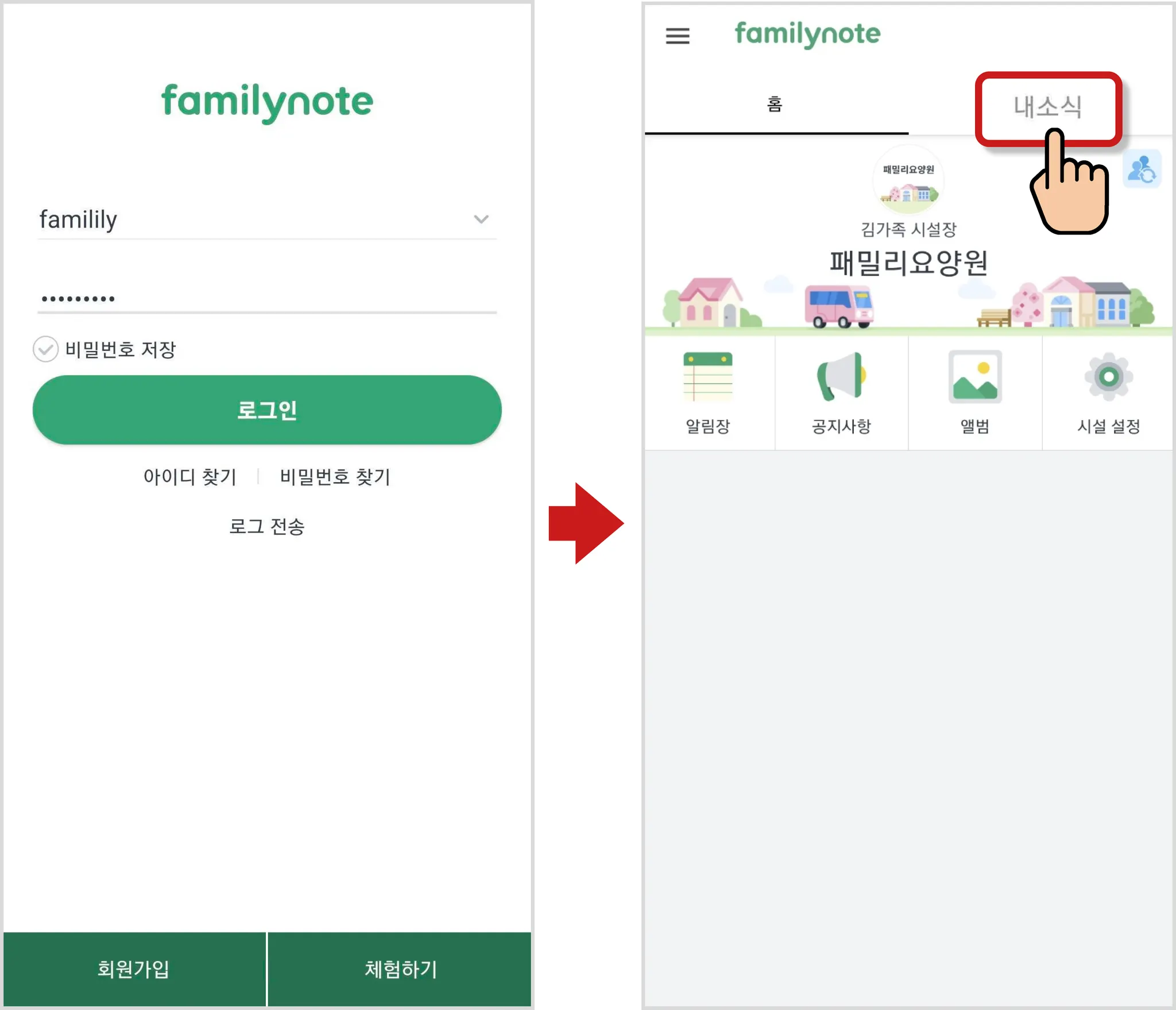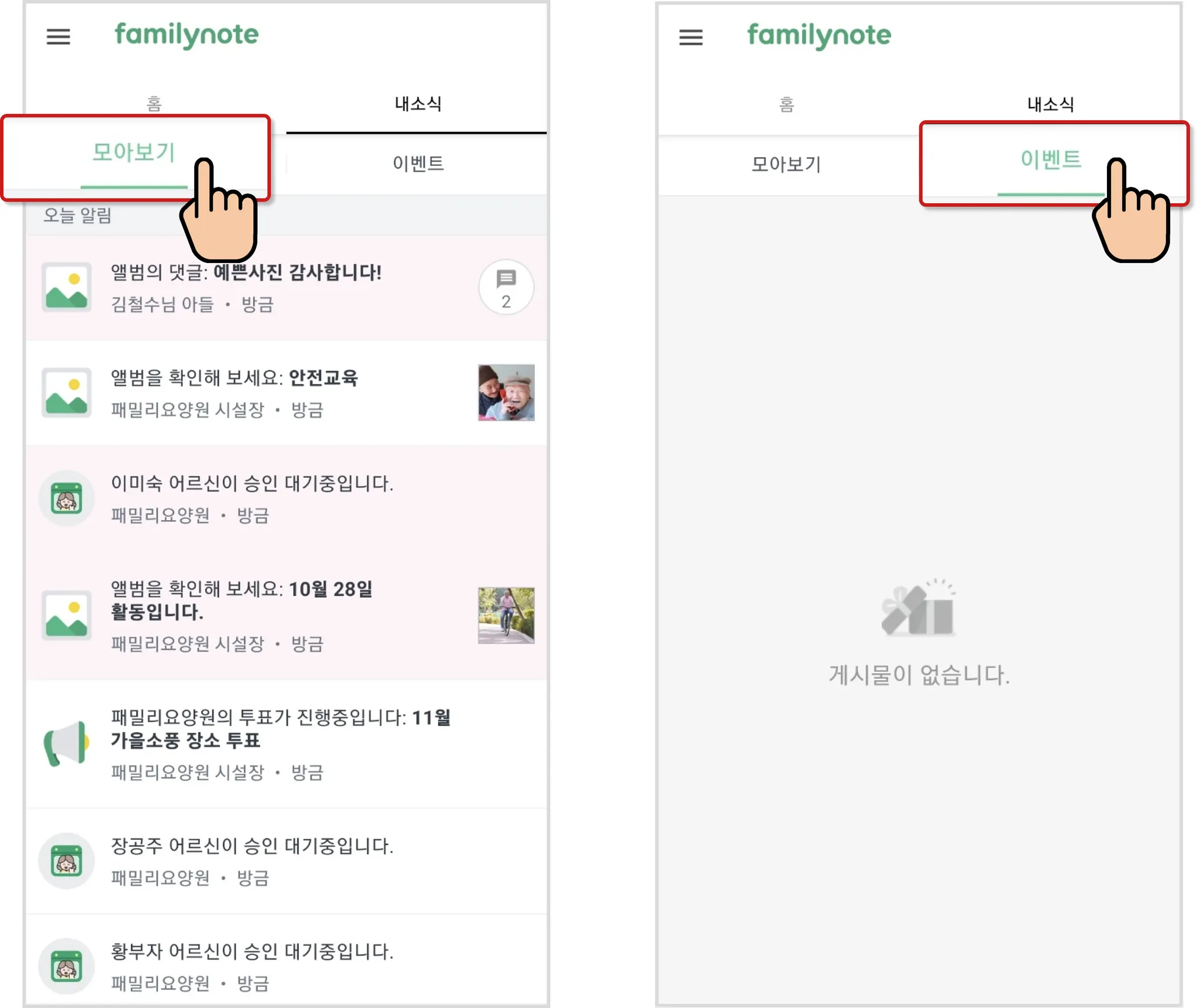 내소식에서는 게시글 업데이트 및 댓글 등 다양한 소식을 알림으로 받을 수 있는 모아보기와 패밀리노트의 소식이 담긴 이벤트를 확인할 수 있어요
