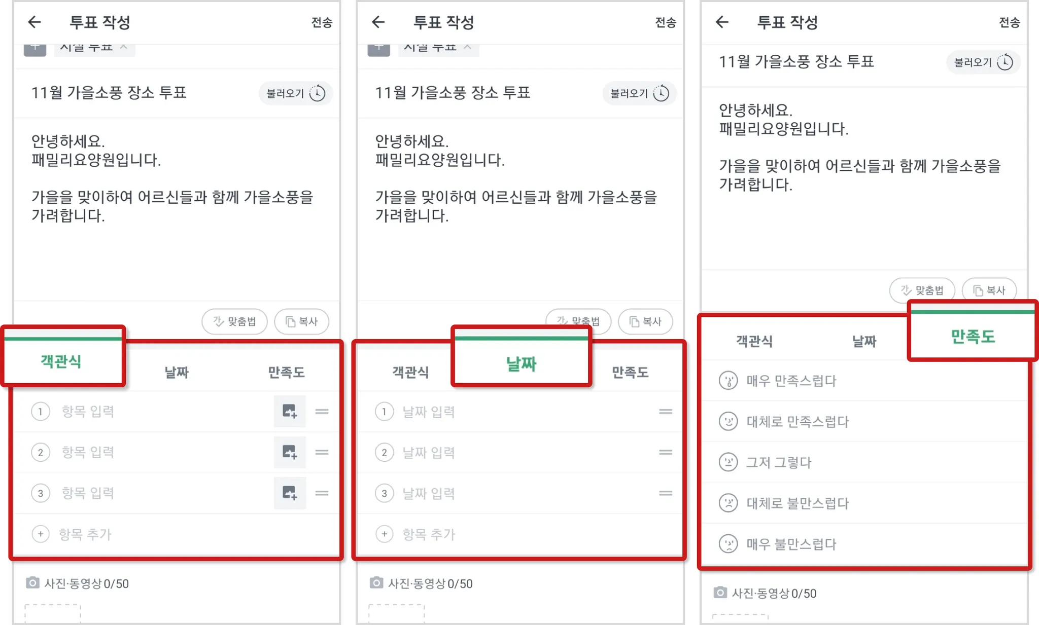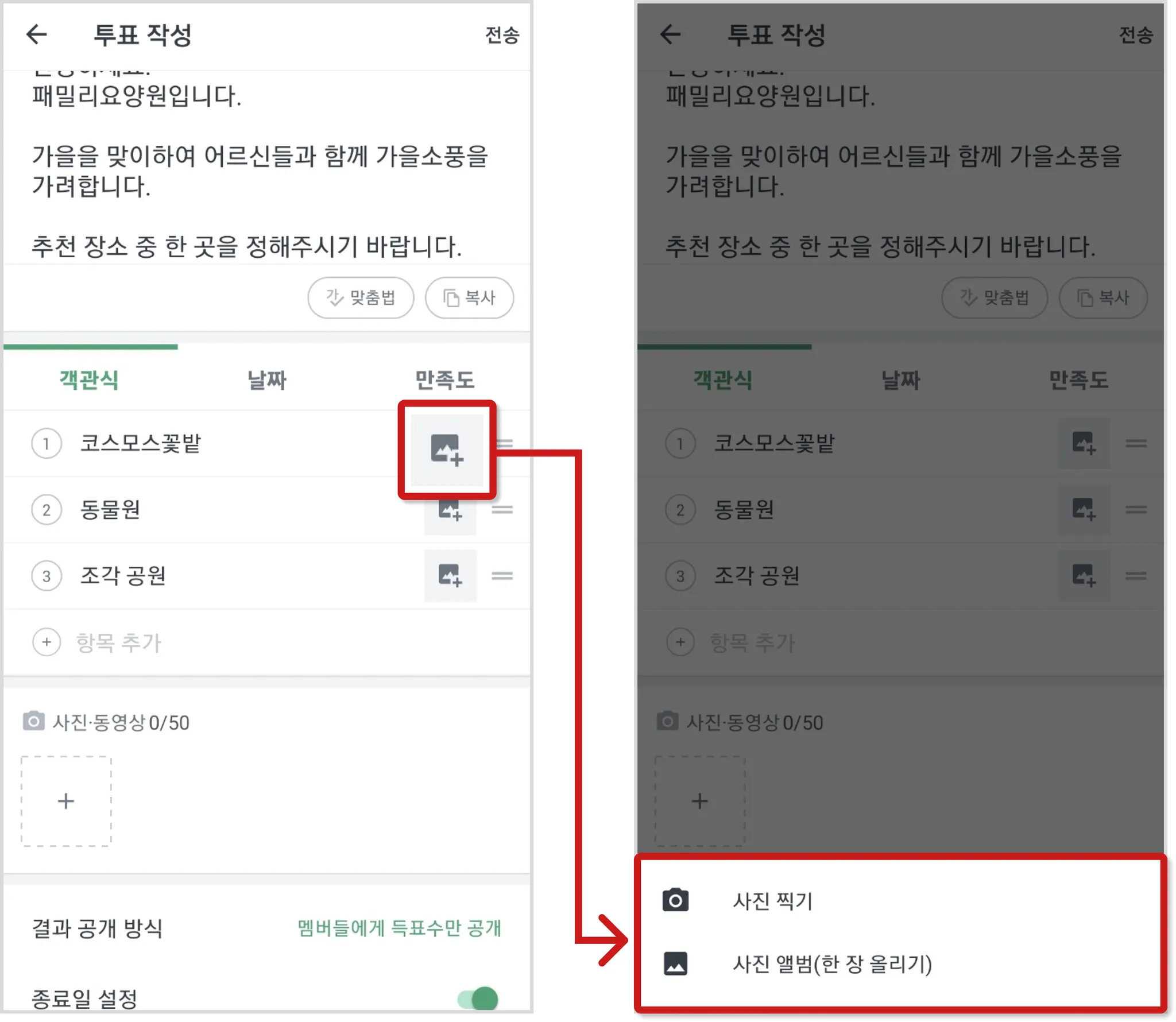 객관식: 투표 항목을 직접 입력하여 설정할 수 있어요.