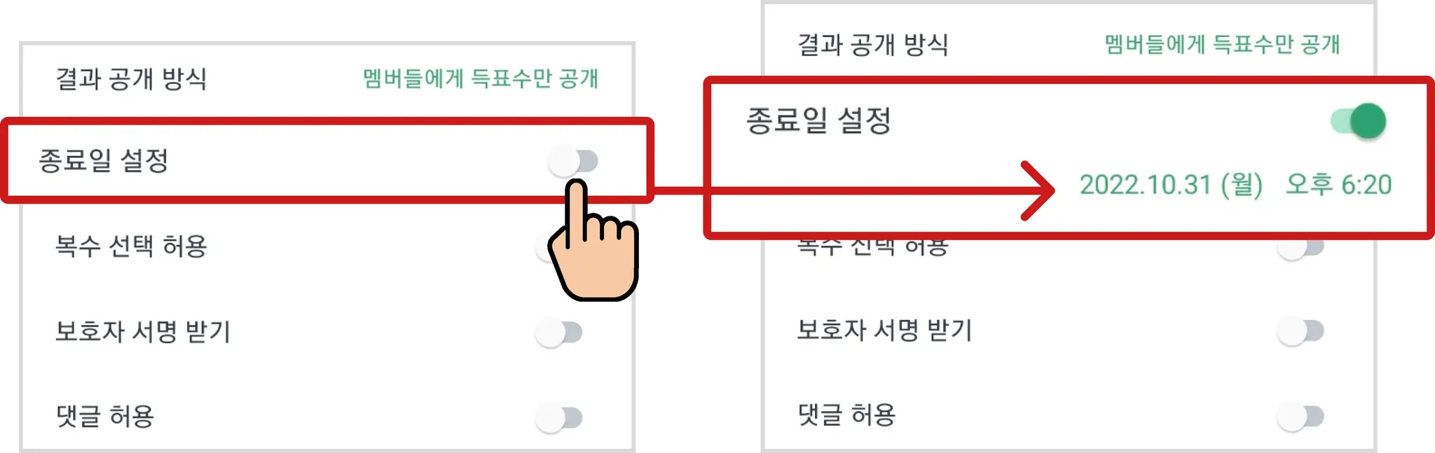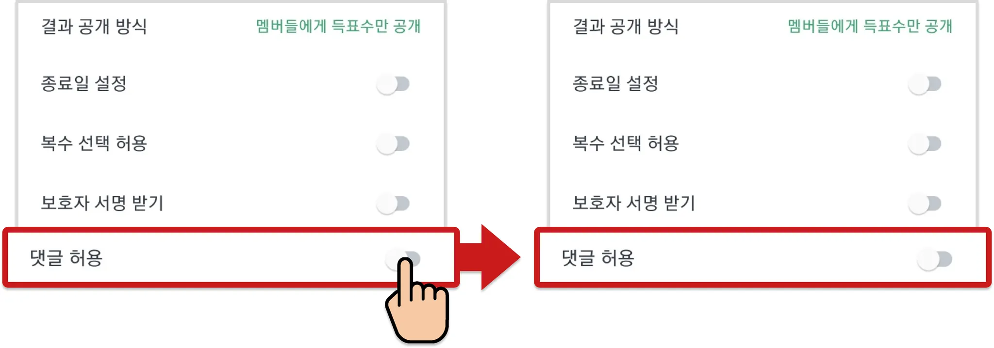 -댓글 허용: 투표 댓글 허용 여부를 선택할 수 있어요.