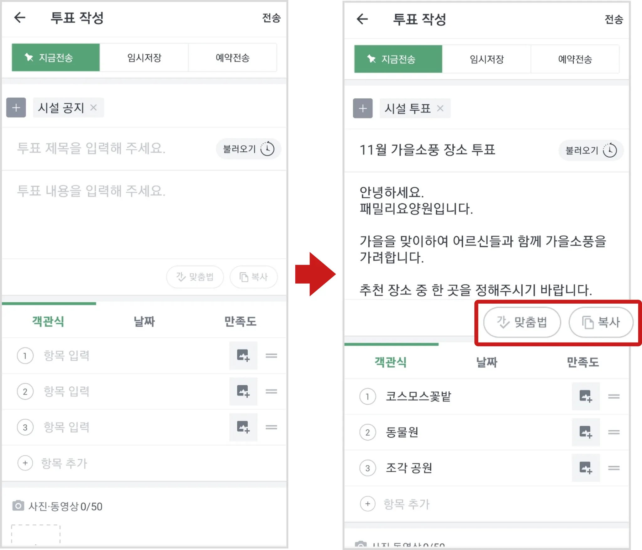 하단의 맞춤법, 복사 기능을 사용해 보세요!
