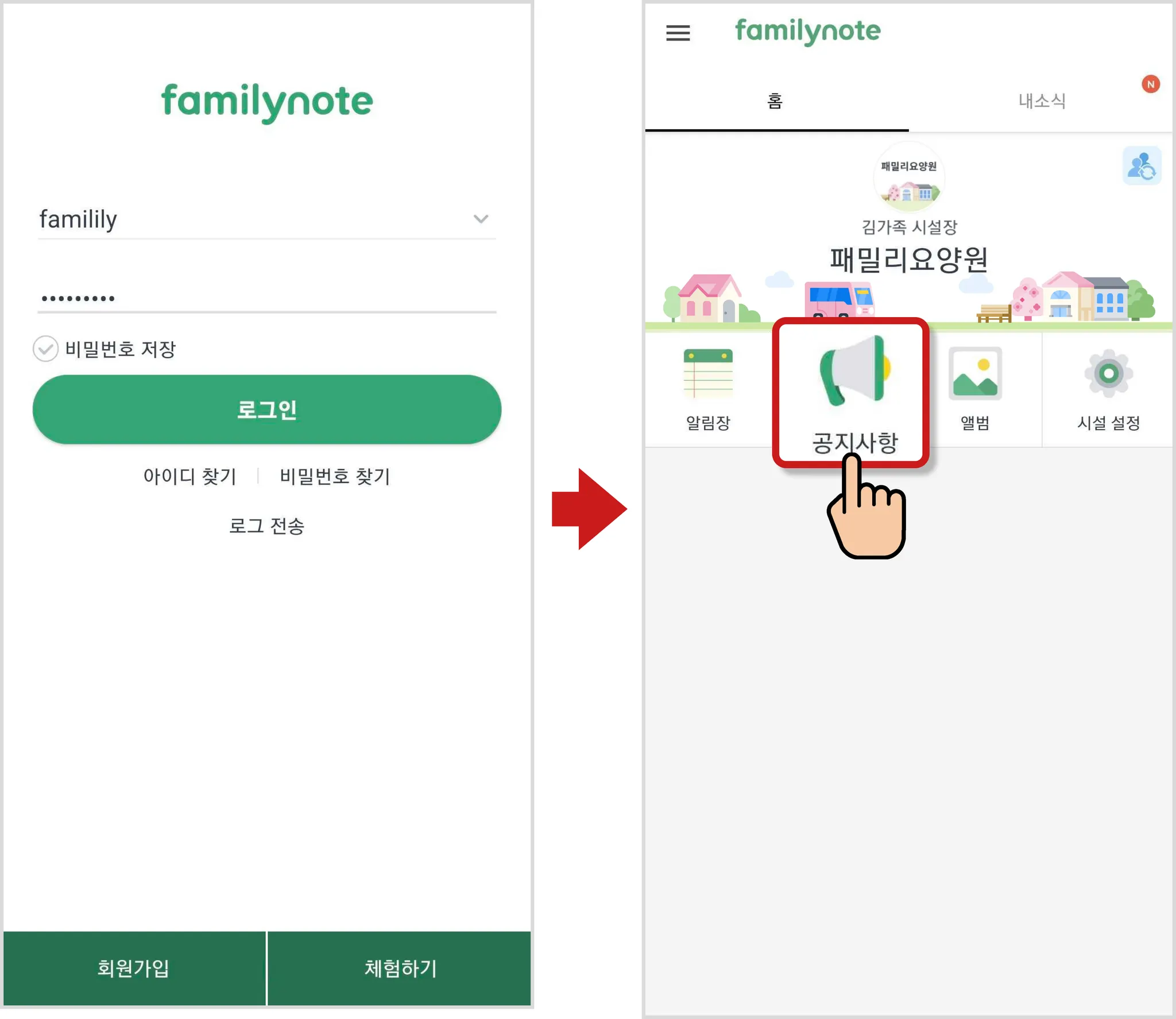 패밀리노트 앱 로그인 후 [공지사항] 메뉴를 선택합니다.