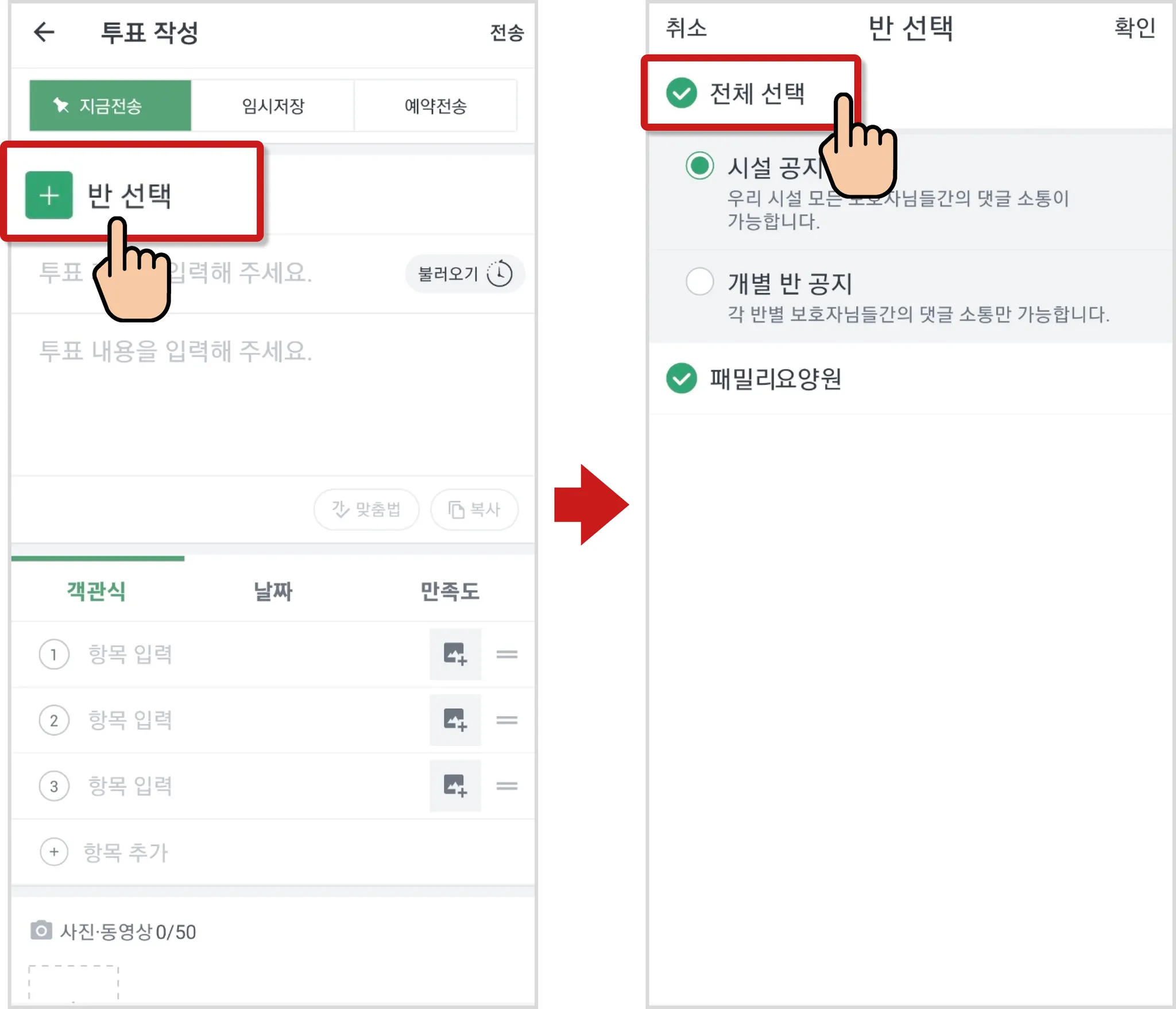 공지사항 투표는 수요조사, 만족도 조사 등 보호자님의 의견을 쉽고 빠르게 모을 수 있어요!