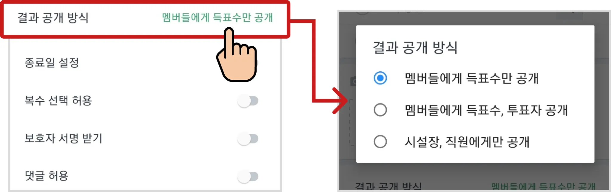 -투표 결과 공개 방식은 세 가지 중 선택할 수 있어요.