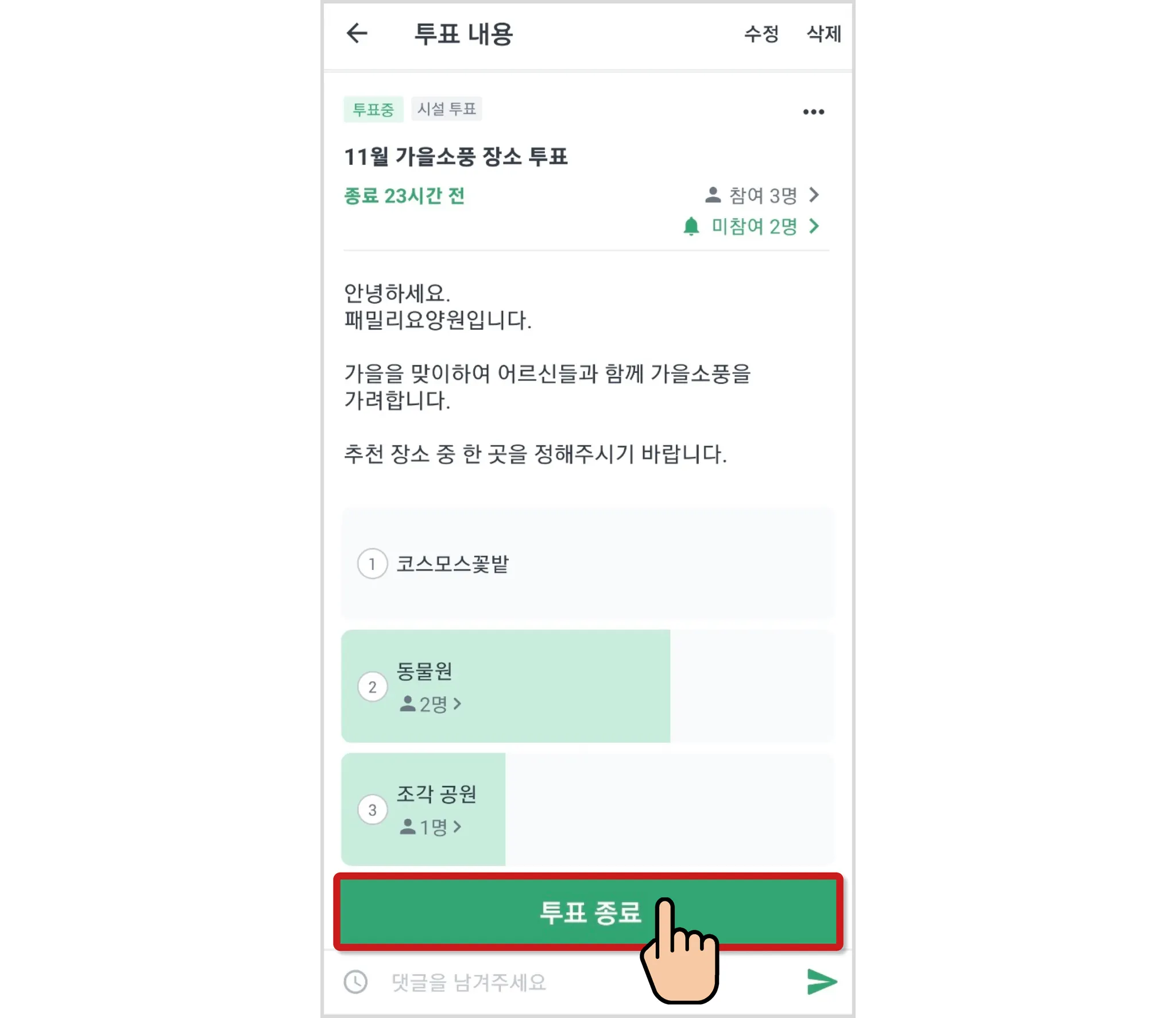 투표 종료를 선택하면 투표가 종료되며, 종료된 투표는 더 이상 투표할 수 없습니다.