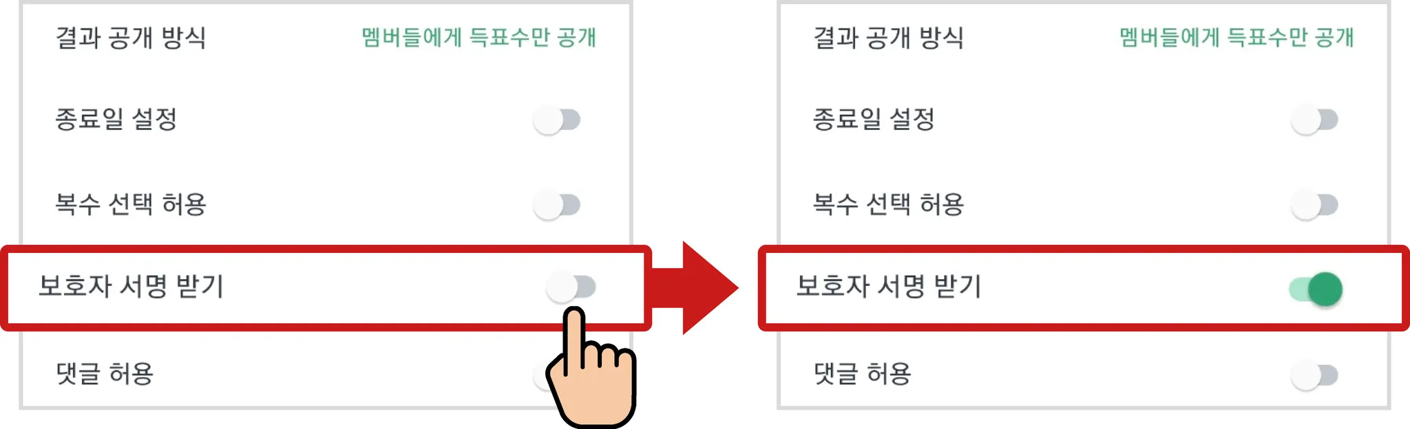 -보호자 서명 받기: 투표에 참여한 보호자 서명이 필요한 경우, 투표와 함께 서명을 받을 수 있어요!