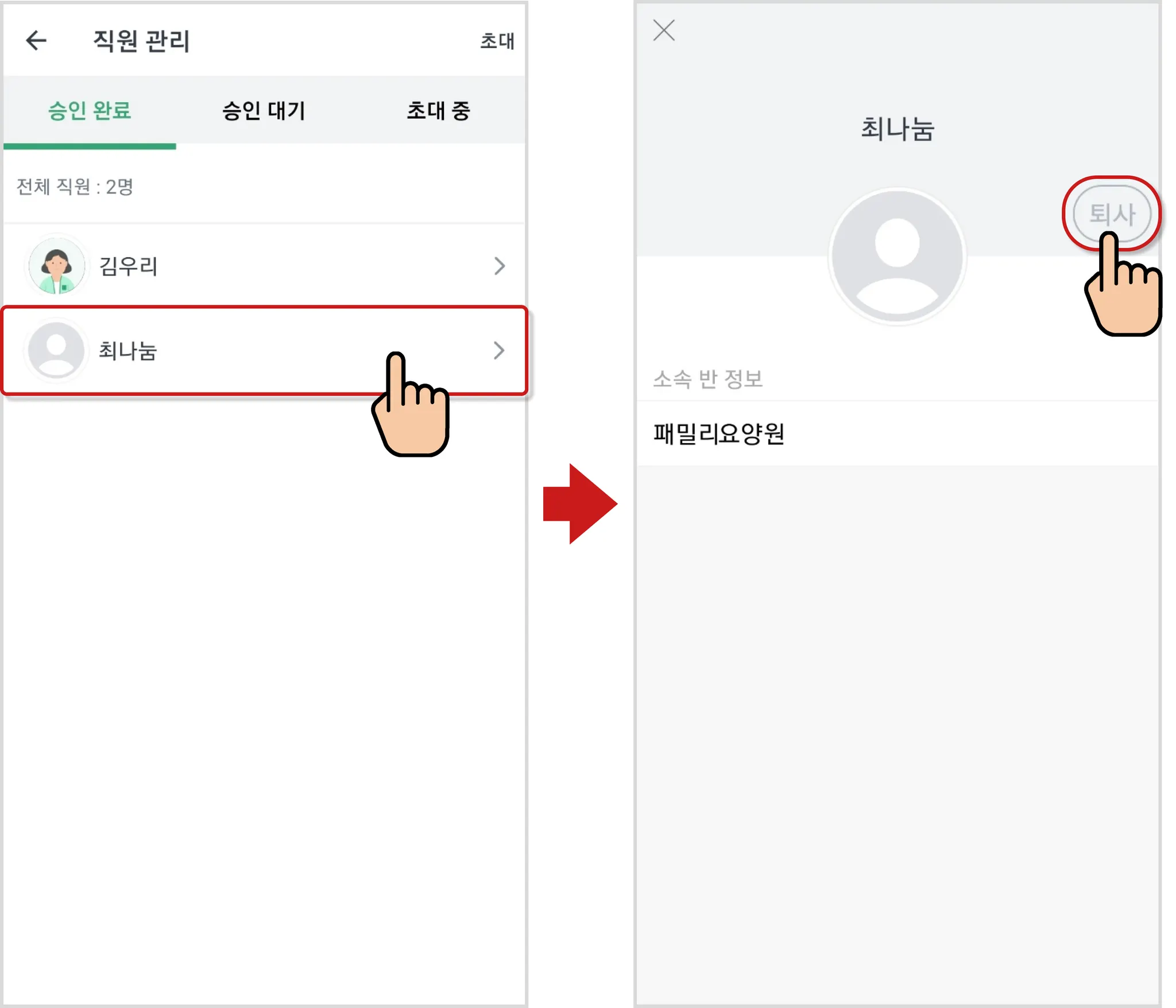 [승인 완료] 승인이 완료된 직원의 목록 확인 및 퇴사한 직원을 퇴사 처리 할 수 있어요.