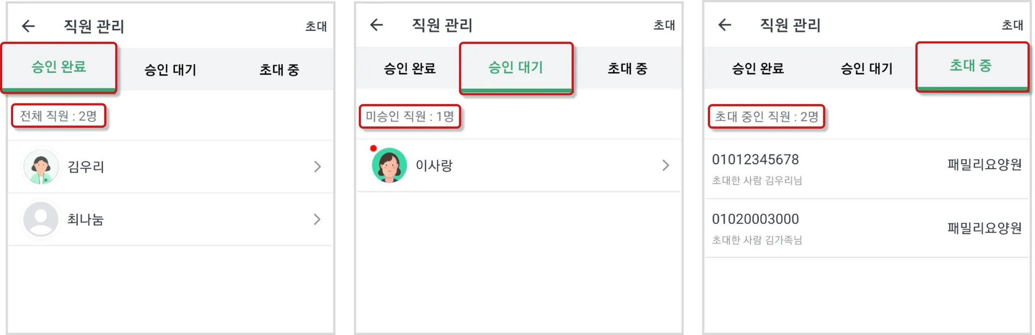 승인이 완료되어 시설의 패밀리노트를 사용할 수 있는 직원의 목록을 볼 수 있습니다.