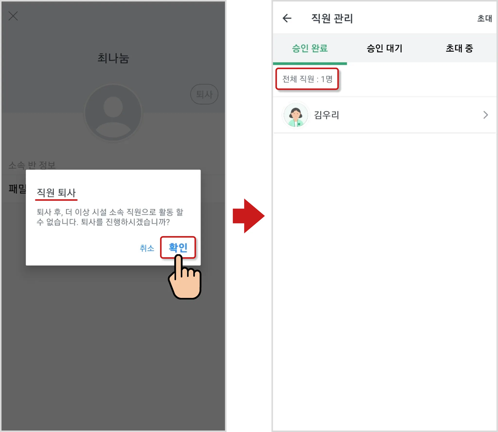 [직원 퇴사] [확인]버튼을 누르면 퇴사 처리가 됩니다. -승인 완료 페이지에서 퇴사한 직원의 이름이 사라진 것을 확인할 수 있어요!