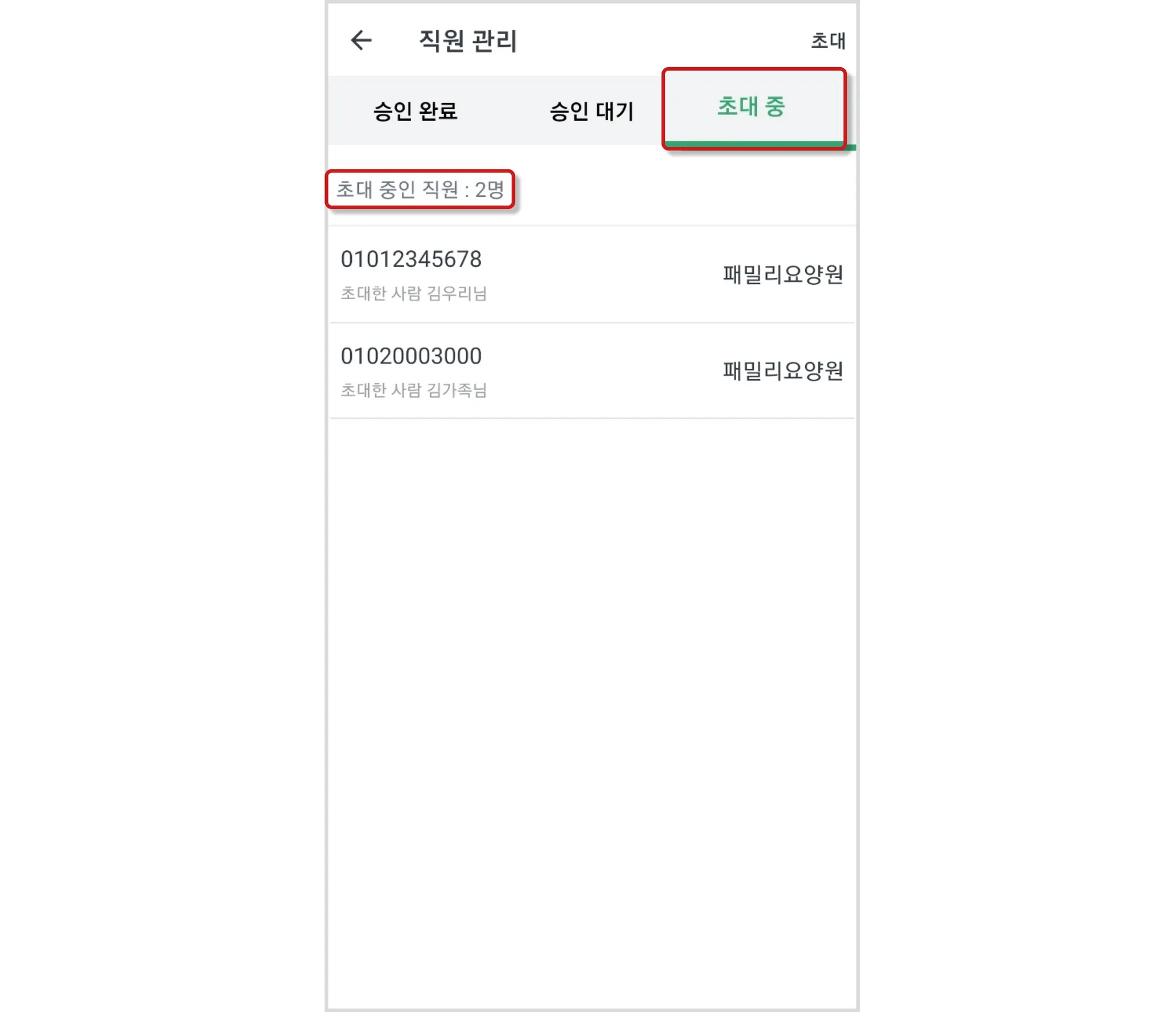 [초대 중]에서는 초대 중인 직원 목록을 확인 및 초대 취소, 초대 문자 재발송을 할 수 있어요.