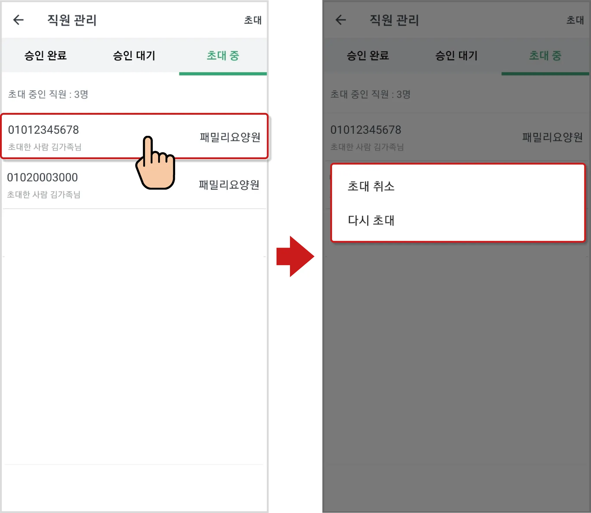 초대 중인 직원을 선택합니다. 초대 취소를 원하면 [초대 취소]를, 초대 문자 재전송을 원하면 [다시 초대]를 선택합니다.