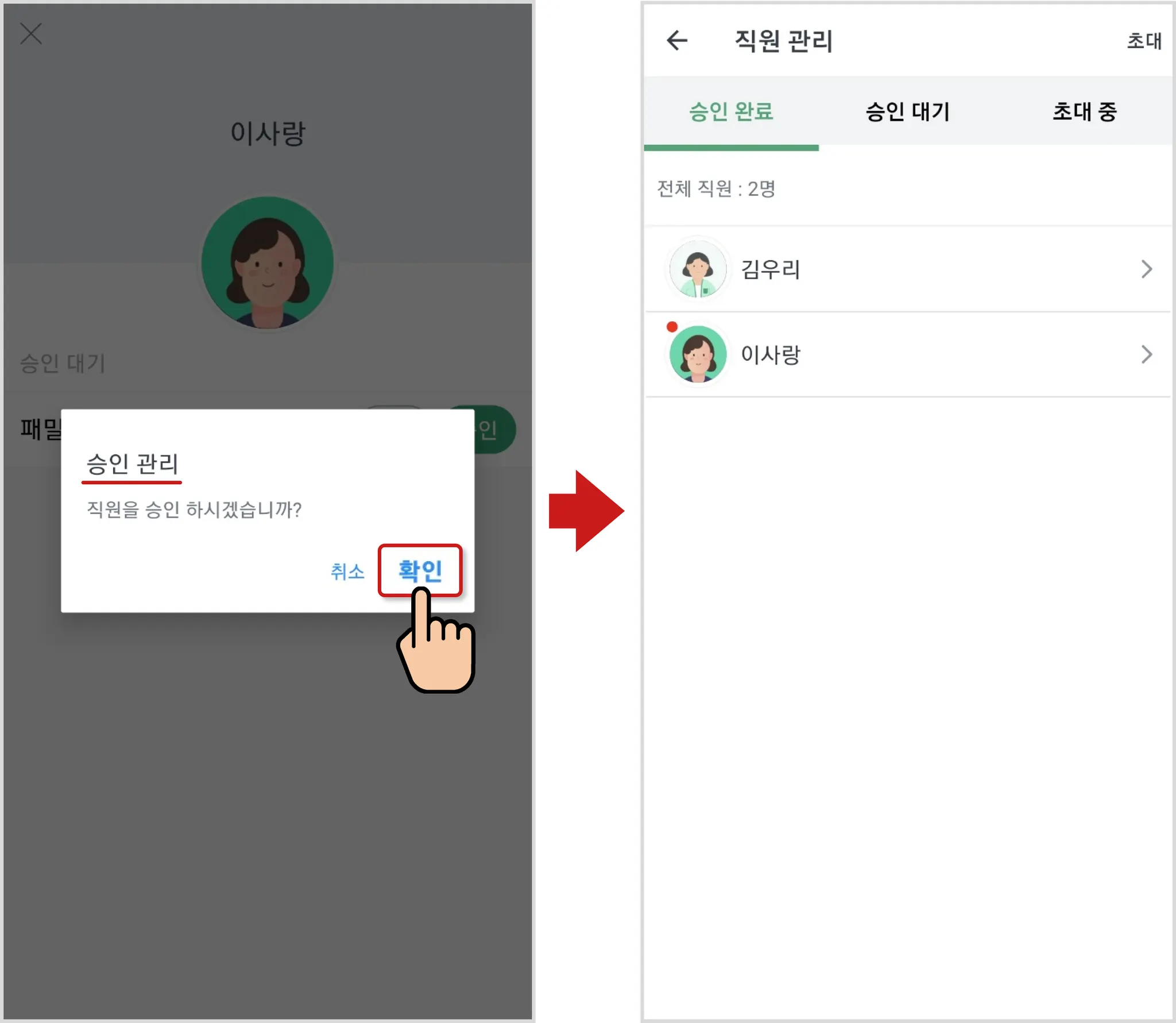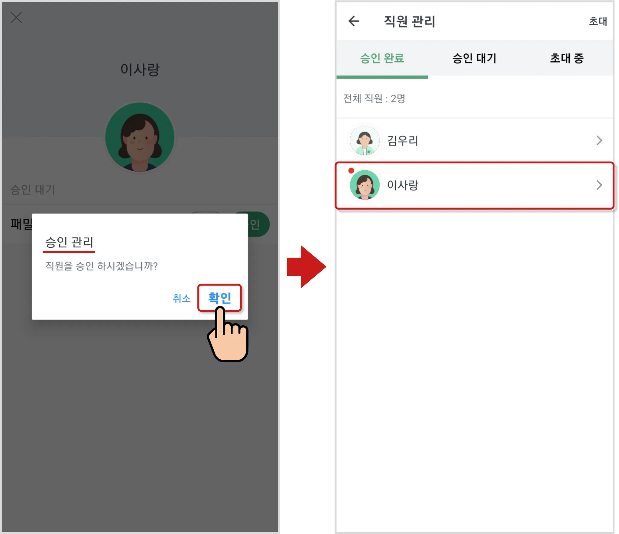 승인을 원할 경우 [승인 관리] [확인]버튼을 누르면 승인이 됩니다. -승인 완료 페이지에서 승인된 직원을 확인할 수 있어요!