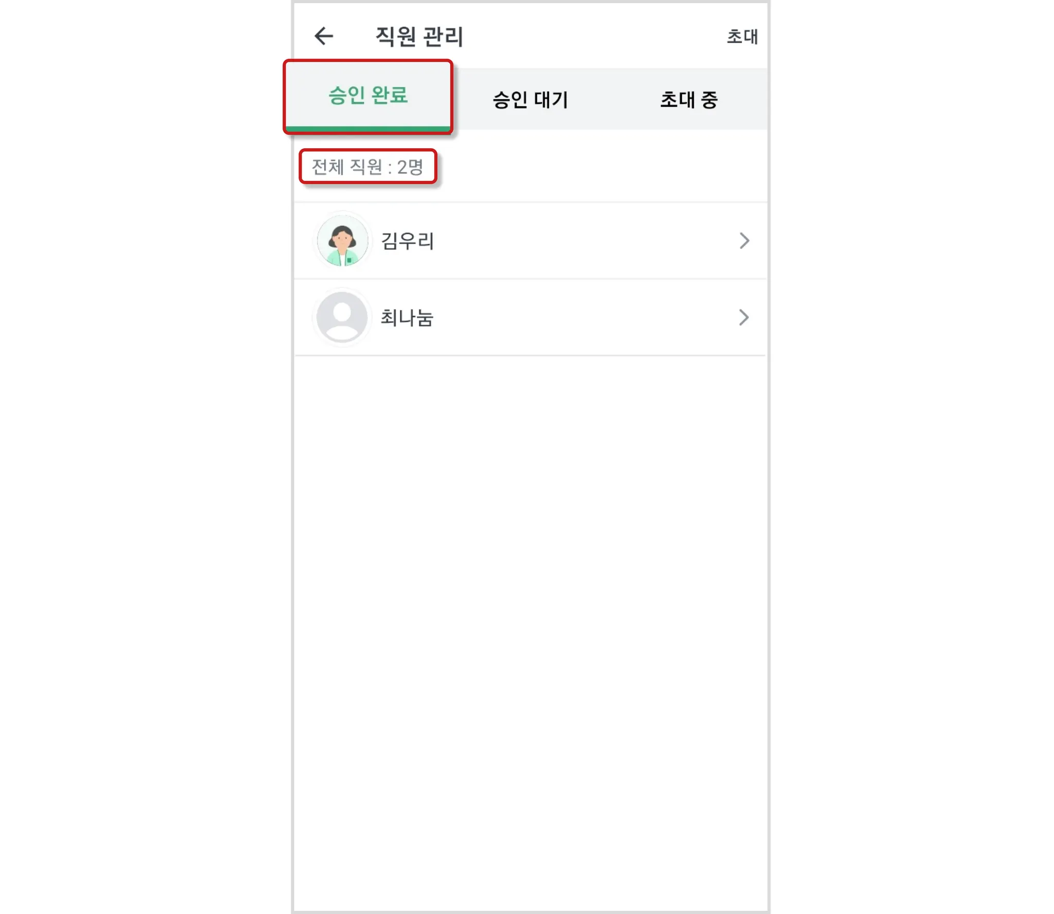 [승인 대기] 승인을 기다리는 직원의 목록을 확인하고, 승인 처리를 할 수 있어요.
