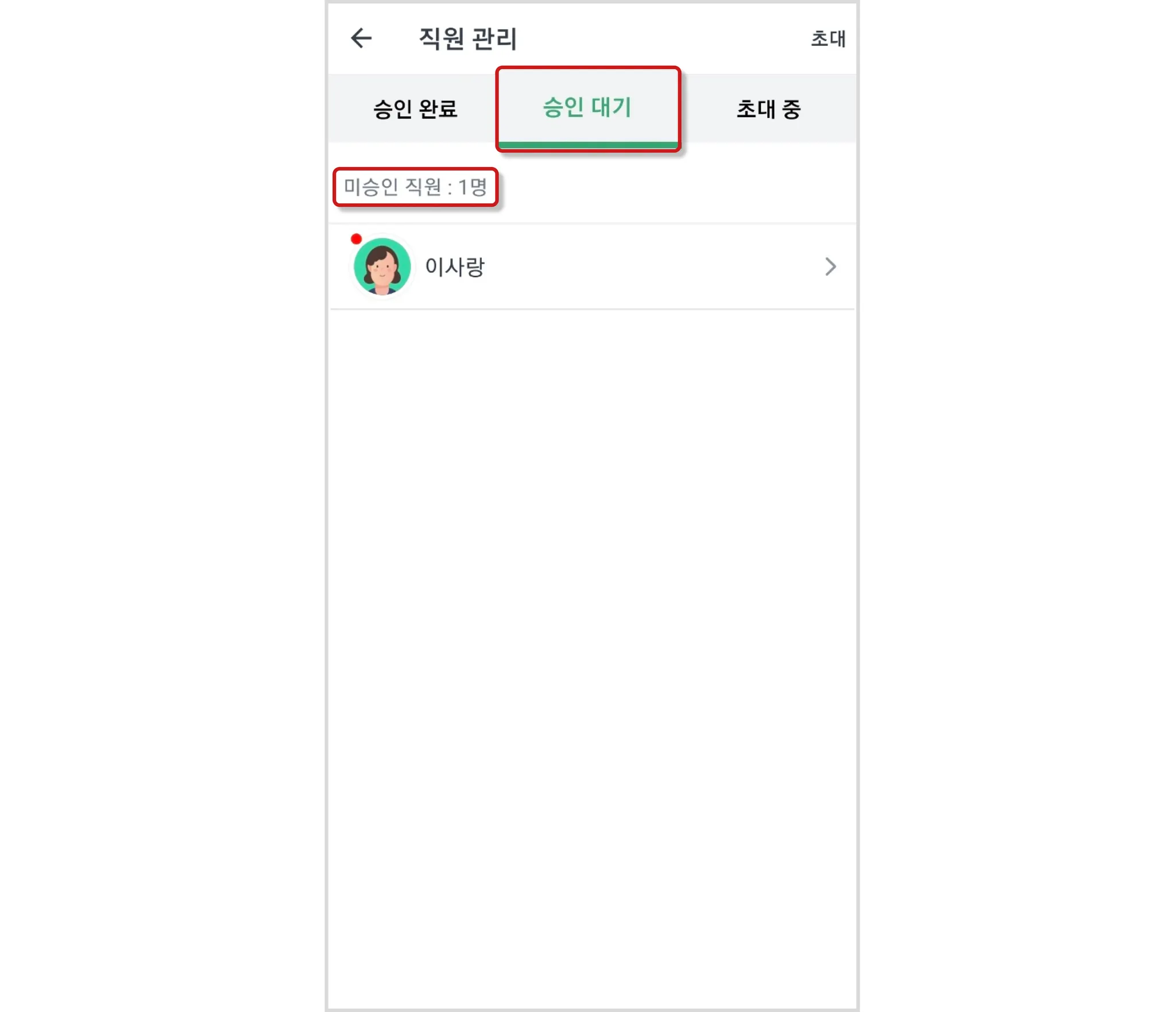 초대장 없이 가입 후, 승인을 기다리는 직원의 목록을 확인 할 수 있습니다.