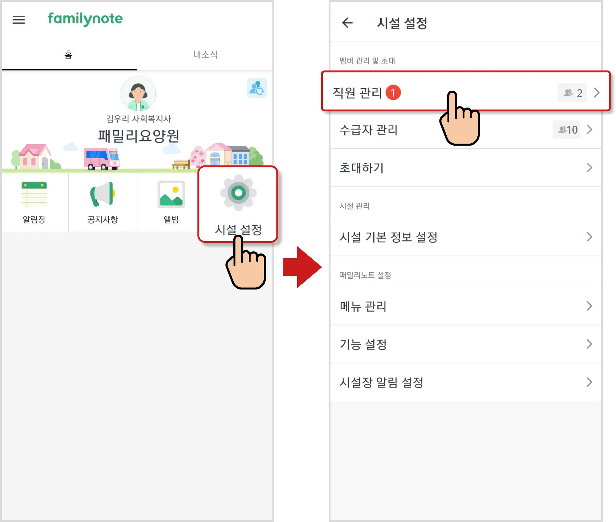 패밀리노트 앱에서 [시설 설정] 메뉴를 선택 후, [직원 관리]를 누릅니다.