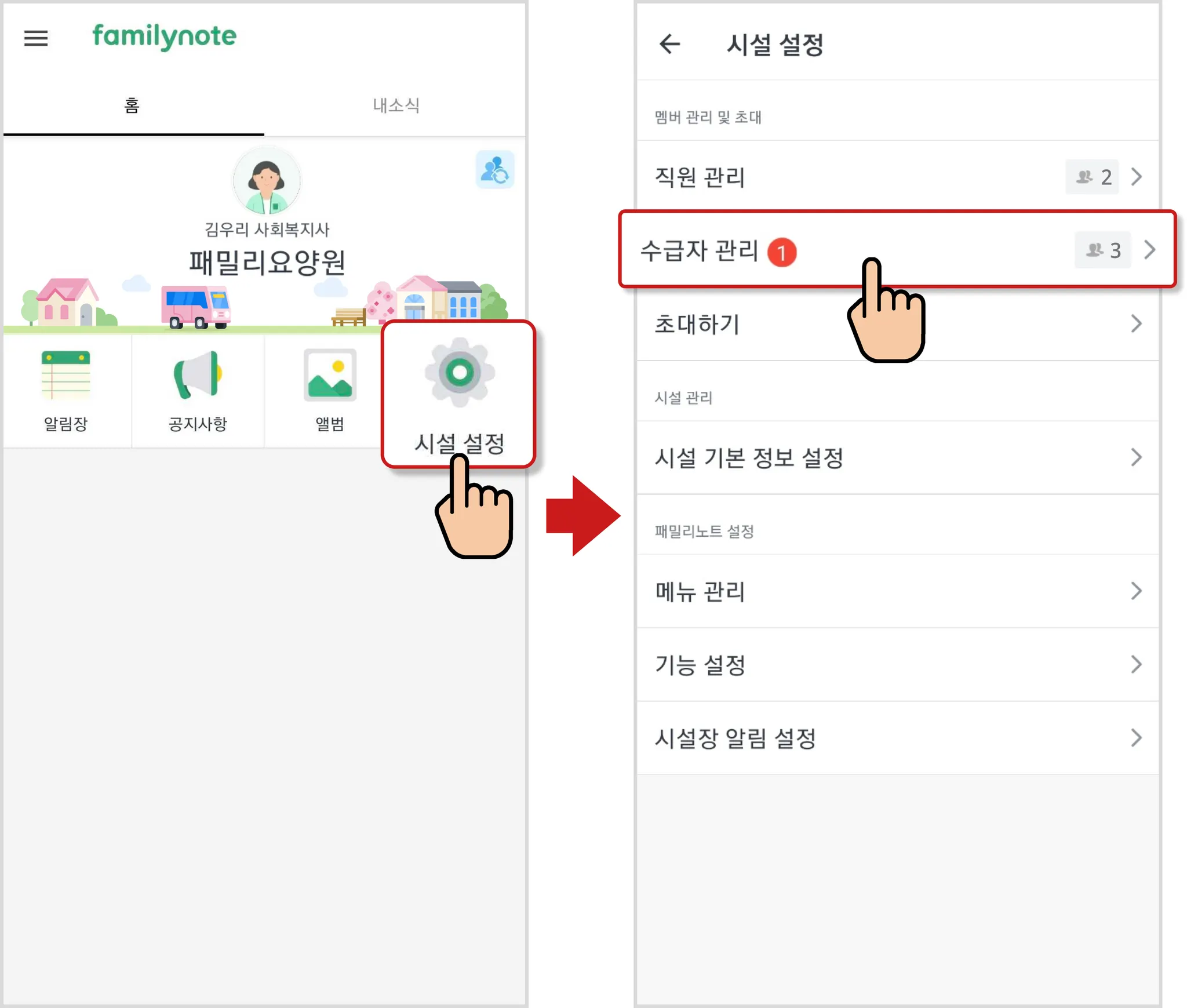 패밀리노트 앱에서 [시설 설정] 메뉴를 선택 후, [수급자 관리]를 누릅니다.