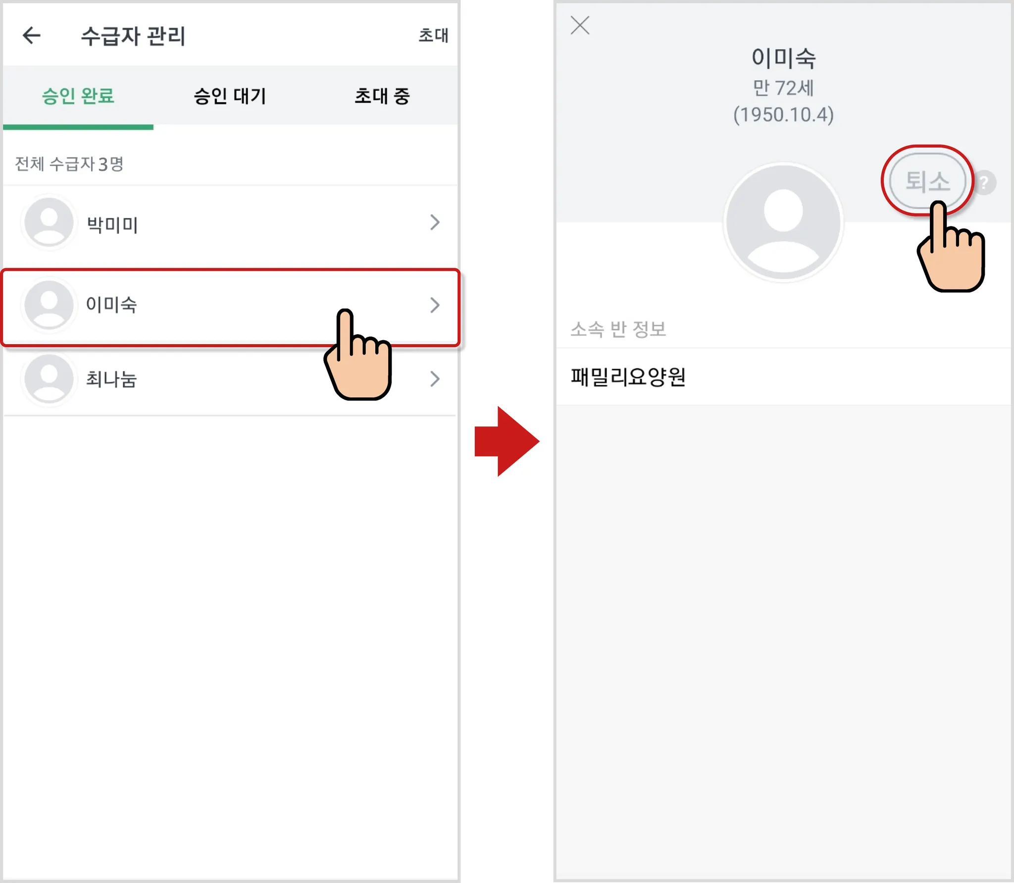 -승인 완료 페이지에서 퇴소한 수급자의 이름이 사라진 것을 확인할 수 있어요!
