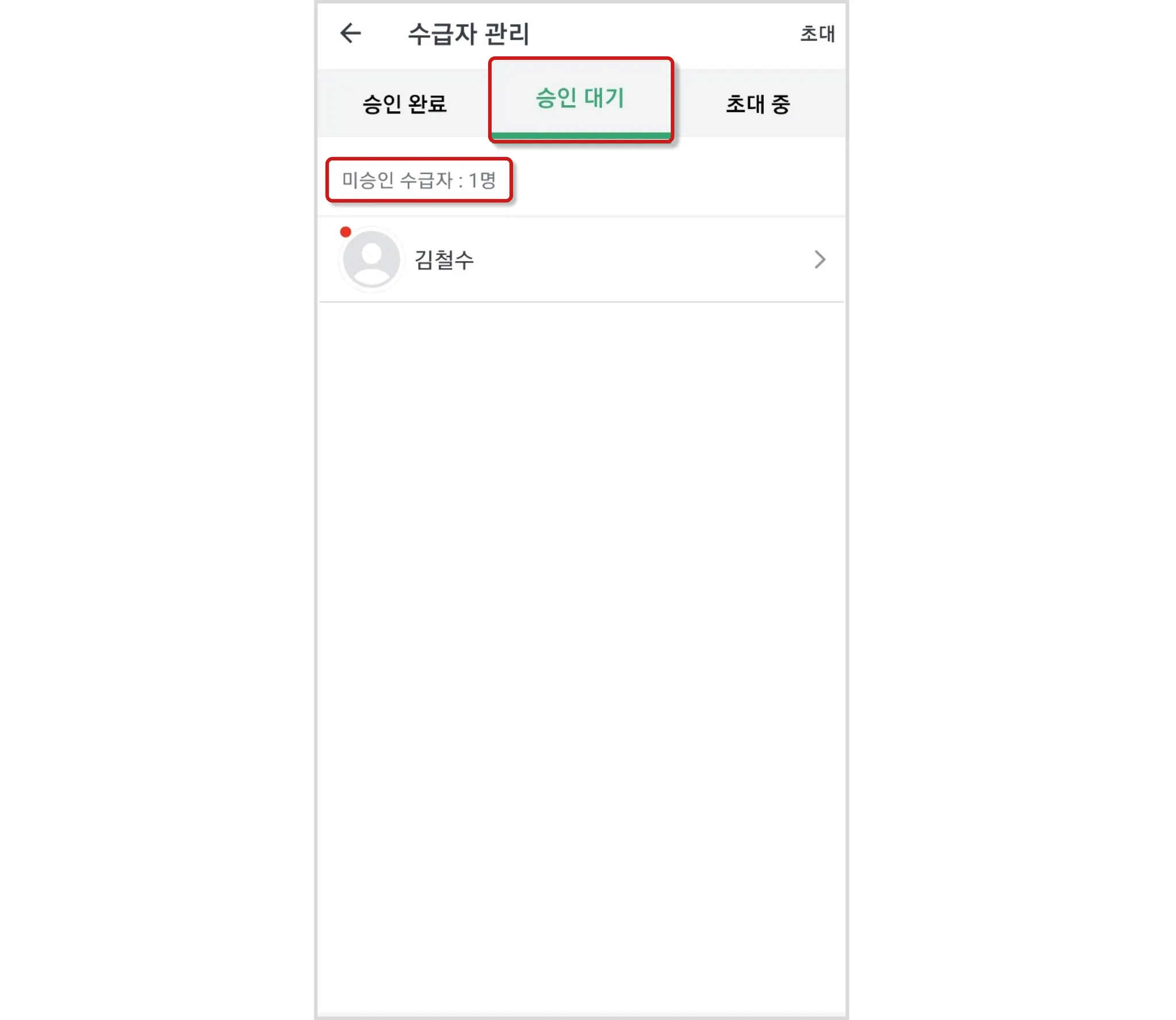 초대장 없이 가입 후, 승인을 기다리는 수급자 목록을 확인 할 수 있습니다.