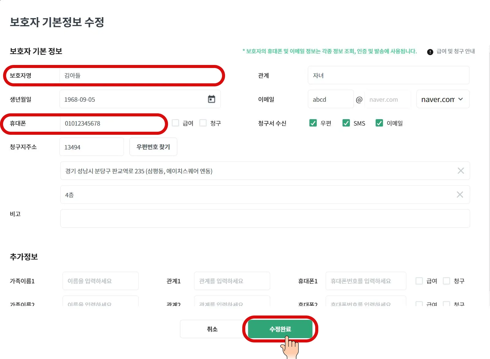 어르신 등록이 완료되었다면, 이번엔 보호자님 정보를 입력해 볼게요.
