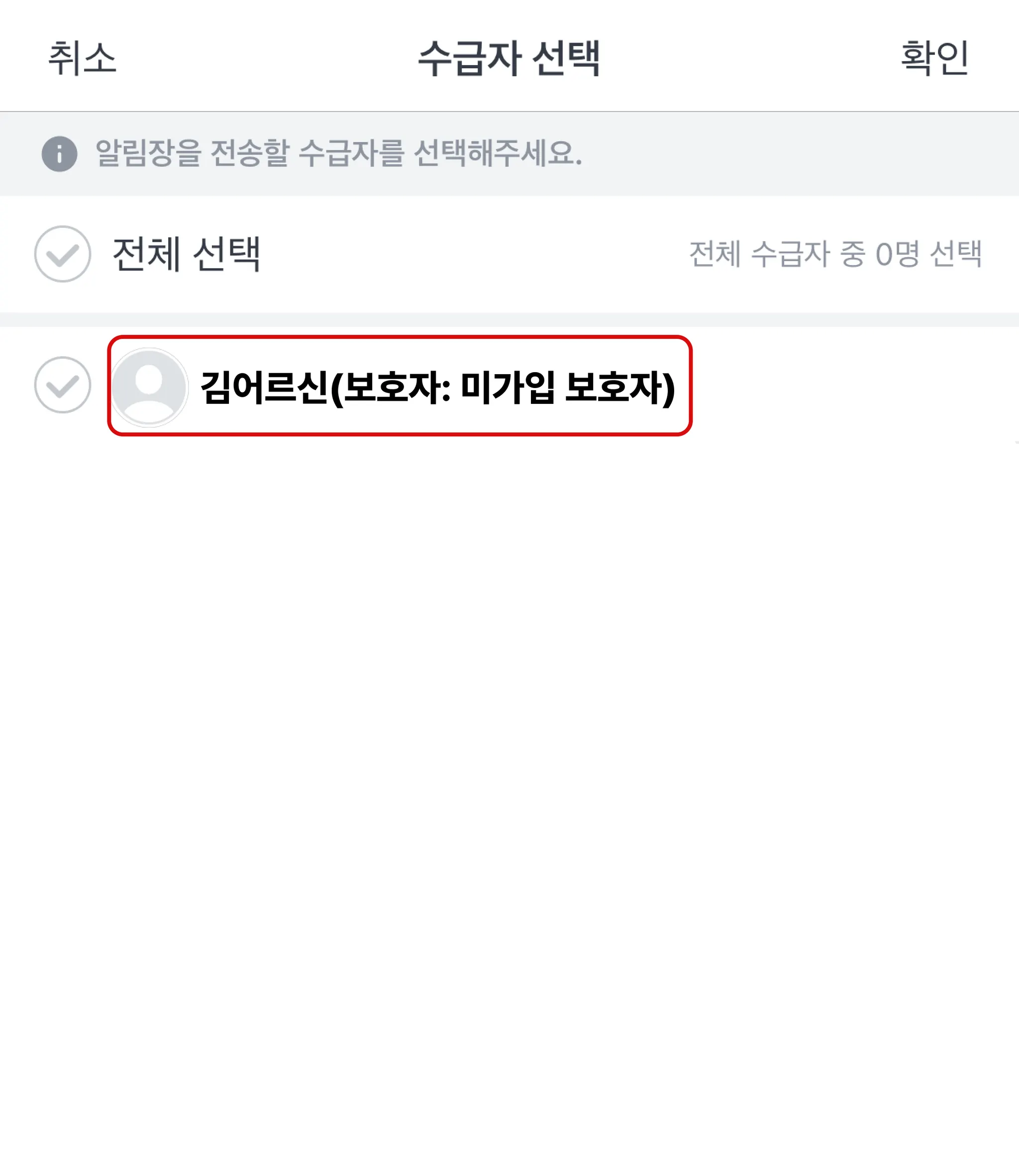 패밀리노트 앱에 들어가서 알림장을 보낼 때, 패밀리케어ERP를 통해 일괄 등록한 어르신의 보호자님은 ‘미가입 보호자’라고 표시되어요!