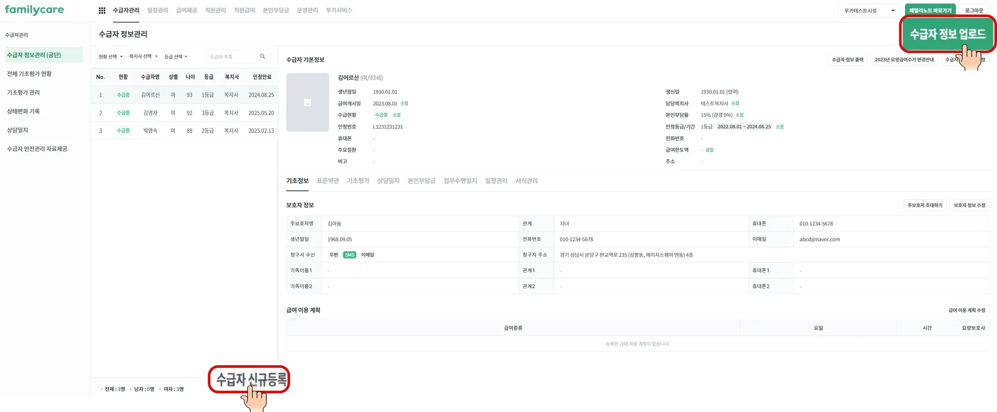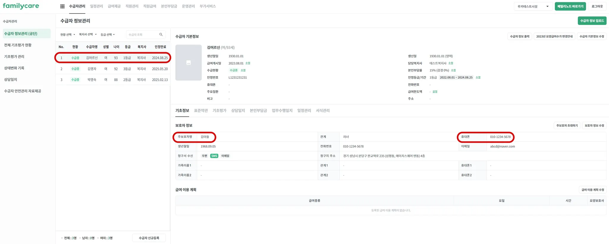 보호자님 정보까지 입력이 완료되었다면, 수급자 정보관리 화면에서 총 3가지 정보를 확인해 주세요!